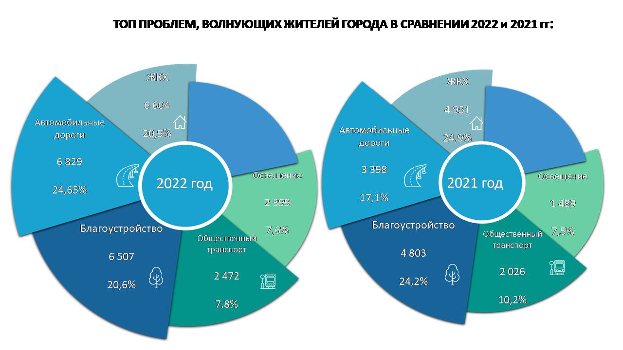 ТОП-5 вопросов, заданных через Интернет и телефон 122, распределились следующим образом: 6829 (24,7%) – автомобильные дороги, 6604 (20,9%) – жилищно-коммунальное хозяйство, 6507 (20,6%) – благоустройство, 2472 (7,8%) – общественный транспорт и 2399 (7,6%) – уличное освещение.
