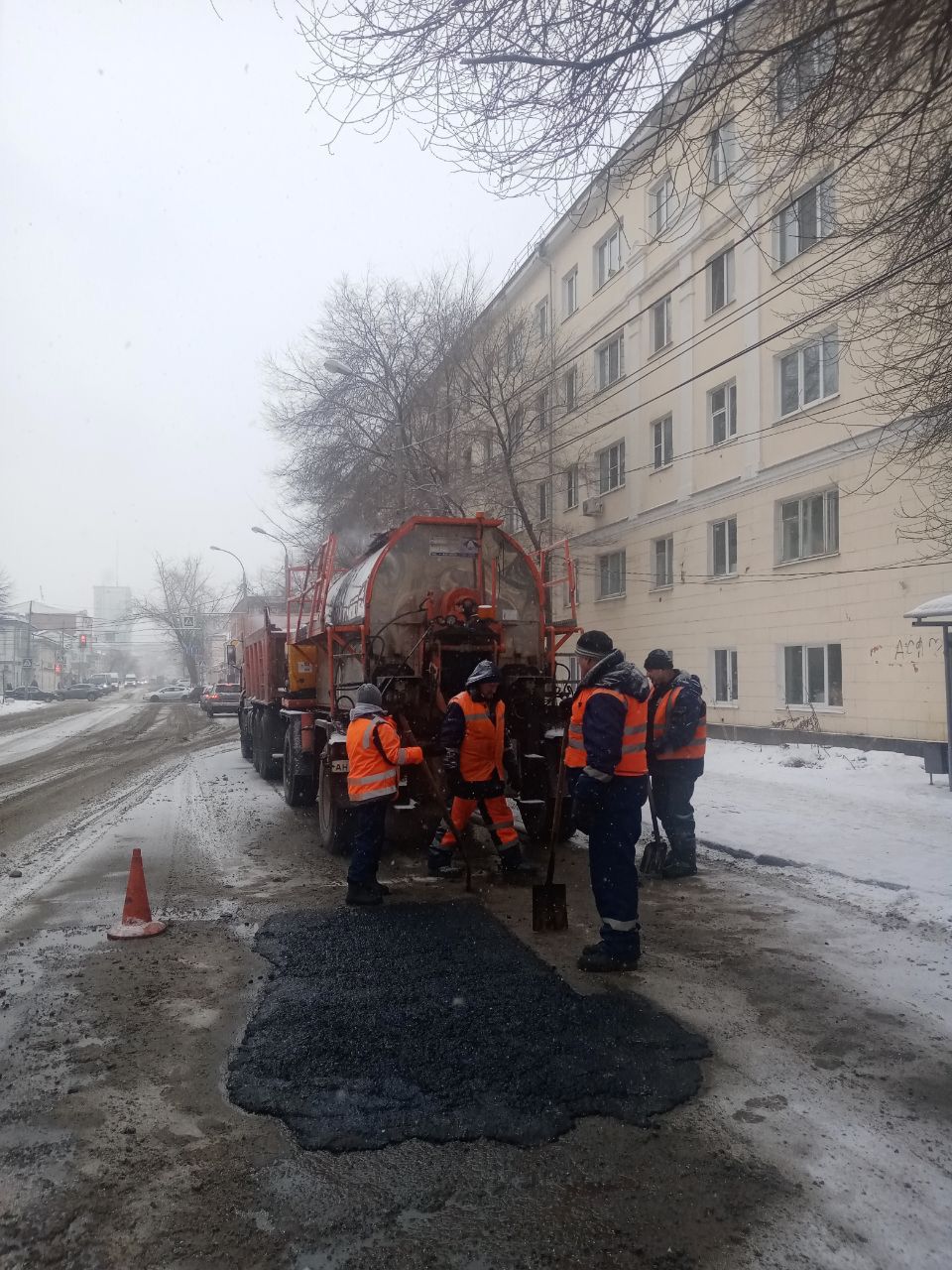 Начиная с минувших выходных МБУ «Дорремстрой» впервые за эту зиму выполняло устранение ям и заделку мест раскопок разогретым до 220 градусов литым асфальтом, доставляемым к месту работ в прицепном термос-миксере «Кохер».