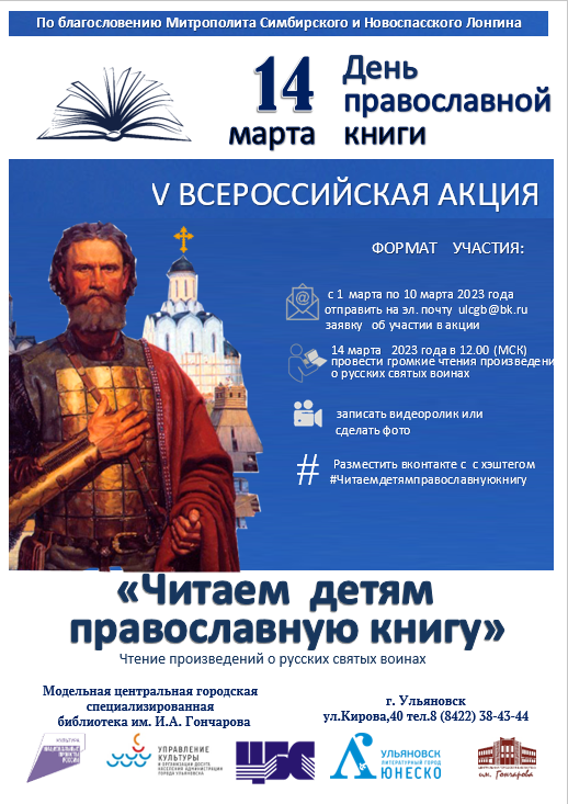 14 марта в 12:00 по московскому времени (в Ульяновске – в 13:00) все участники акции: школьники, библиотекари, педагоги и священнослужители – проведут на своих площадках громкие чтения произведений о русских святых воинах: Илье Муромце, Дмитрии Донском, Александре Невском и Федоре Ушакове.