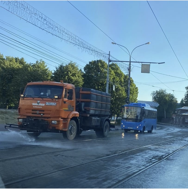 Для предотвращения возникновения колейности на асфальтовом покрытии МБУ «Дорремстрой» увеличило интенсивность увлажнения проезжей части при помощи поливомоечных автомобилей.